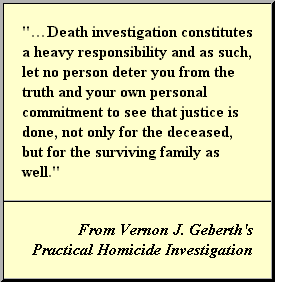 Geberth says course is designed to reacquaint law enforcement with why they entered into investigation to begin with," a point he makes in various ways.