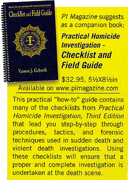 The book is geared towards law enforcement, to private investigators, and some sections, such as notifying the next of kin, are going to be little benefit to those without a badge. If you are involved in criminal defense, though, the book will offer a wonderful starting point in evaluating the procedures of a homicide investigation and looking for potential areas of neglect, as Geberth breaks down the duties of the first officer on scene, the preliminary investigation, methods of caring for evidence, and crime scene contamination. A new chapter on DNA analysis will help the private investigator understand this forensic tool and how it applies to the investigative process. The format of the book makes its many pages more readable than the average textbook, as Geberth begins with the initial crime scene discovery and then moves in chronological fashion through the investigation, dropping in 90 case studies to lend real-life examples to the procedural guide.